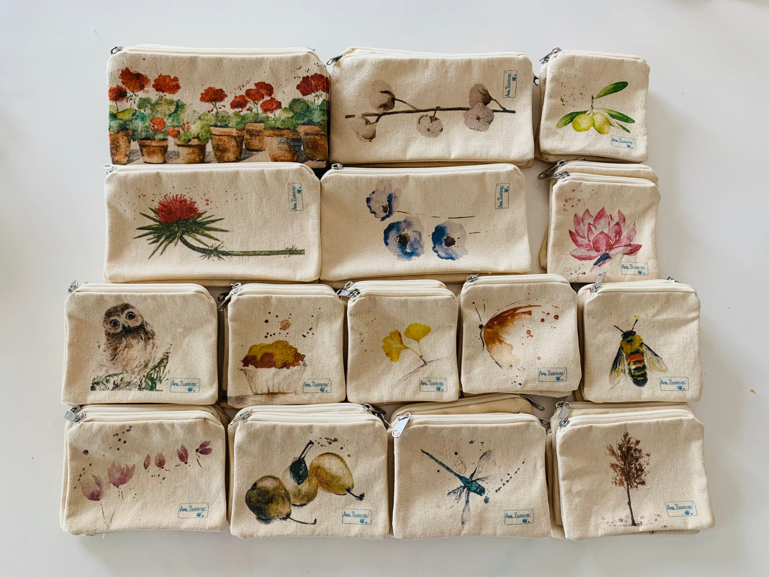 Acuarelas llevadas a telas de algodón mediante estampación. En la tienda encuentras monederos y estuches confeccionados a mano y diseñados con acuarelas únicas.